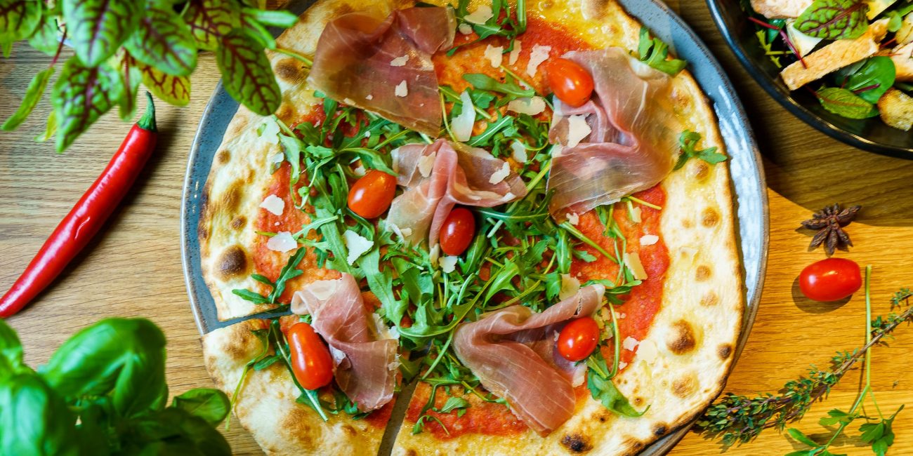 49 złsos pomidorowy, mozzarella, grana padano, prosciutto crudo, rukola, pomidorki,